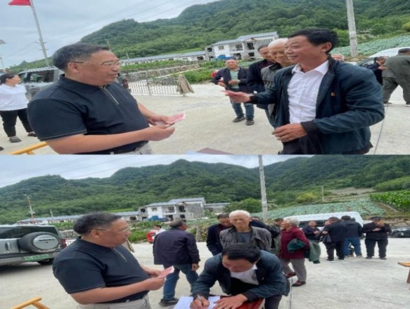 公司董事長鄧衍貴為參會村級黨員發放慰問金,細心交談真情問候。